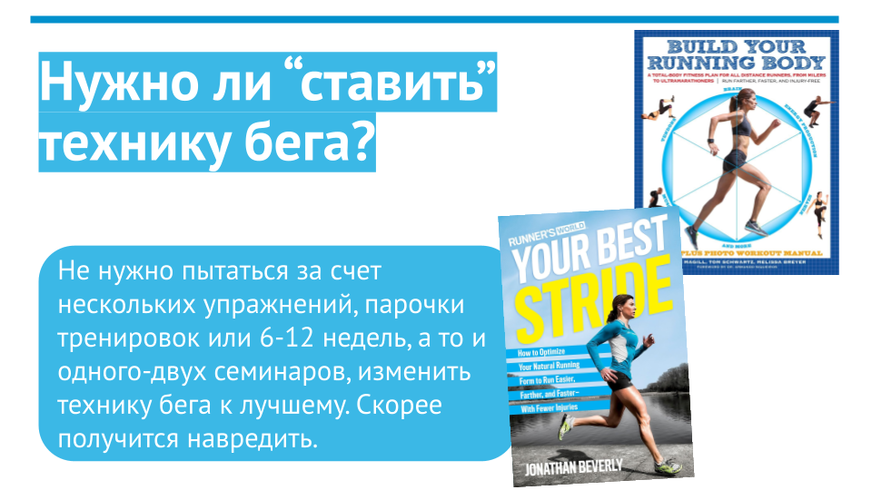 Не нужно пытаться за счет нескольких упражнений, парочки тренировок или 6−12 недель, а то и одного-двух семинаров, изменить технику бега к лучшему. Скорее получится навредить.