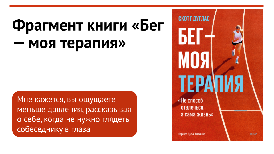 Психотерапевт Сепиде Сареми добавляет, что концентрация на беге может снизить эмоциональную интенсивность других сложных тем. «Мне все начинает казаться легче, — говорит она. — Даже если вы говорите о чем-то тяжелом, например о раковом заболевании вашей мамы, чувствуете вы себя иначе, поскольку в этот момент вы переживаете множество ощущений в своем теле. Вы как будто отвлекаете этим свой организм, и вам становится легче говорить на сложные темы».