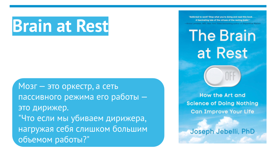 У мозга нет выключателя, и термин «отдых» вводит в заблуждение. Оркестр все еще на месте, он продолжает играть. И вы если прислушаетесь, окажется, что эта музыка великолепна.