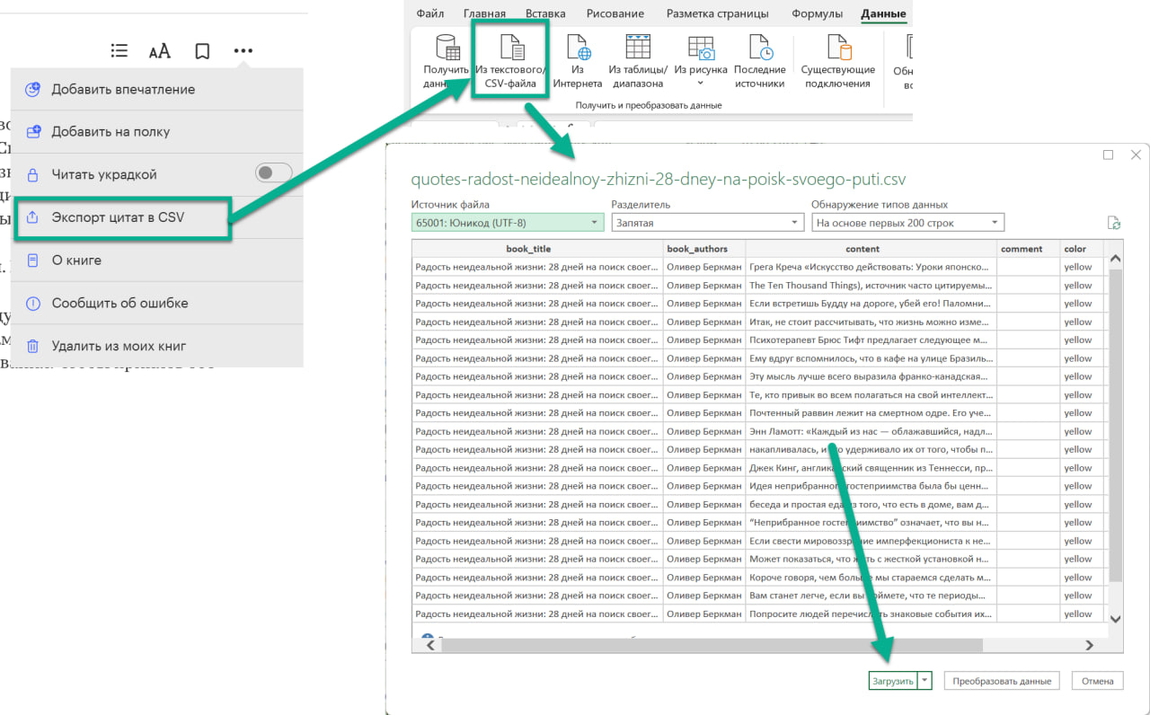 — Используем опцию "Экспорт цитат в csv" в самих Яндекс.Книгах.
