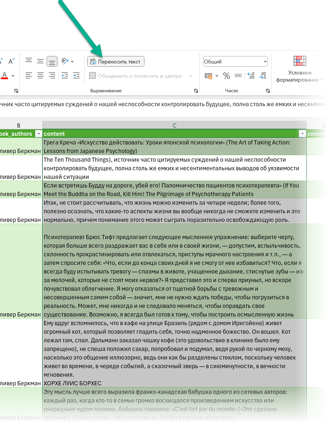 Еще можно выделить весь столбец с самими цитатам (content), нажать Ctrl + пробел (выделение всего столбца) и применить "Перенос текста" на ленте. Тогда будет видно цитаты целиком. Вот так:
