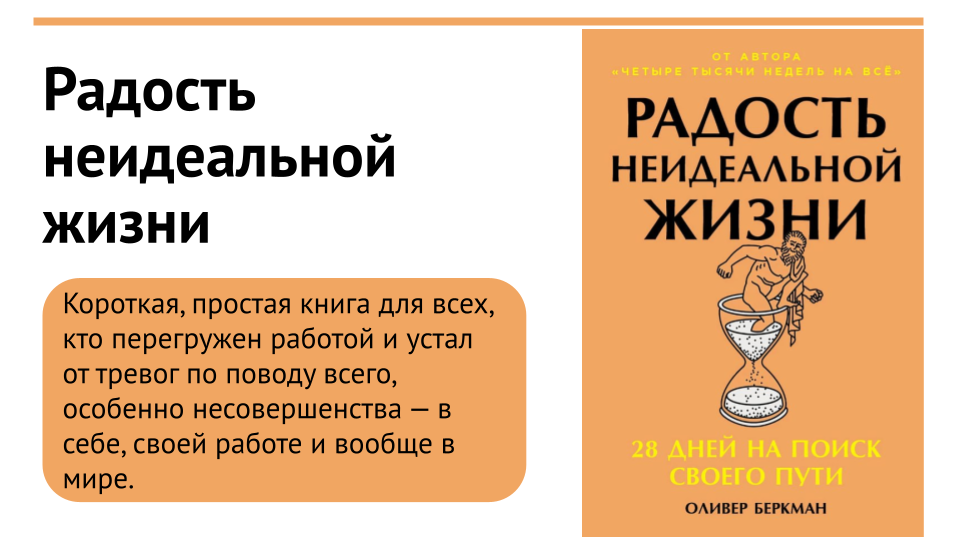 Короткая, простая (но содержательная) книга для всех, кто перегружен работой и устал от тревог по поводу всего, особенно несовершенства — в себе, своей работе и вообще в мире.