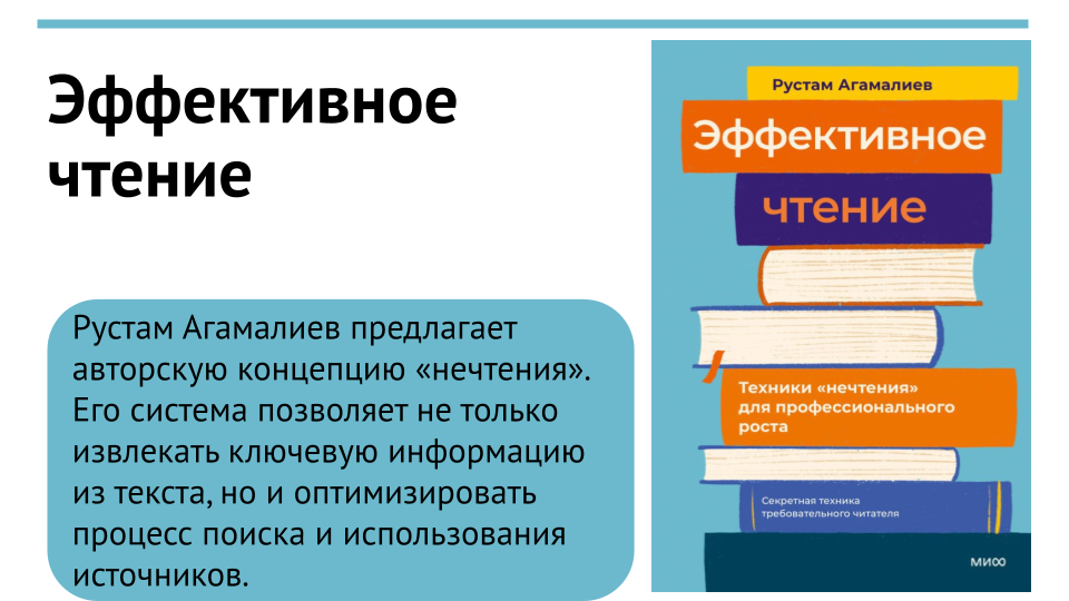 Рустам Агамалиев предлагает авторскую концепцию «нечтения». Его система позволяет не только извлекать ключевую информацию из текста, но и оптимизировать процесс поиска и использования источников.