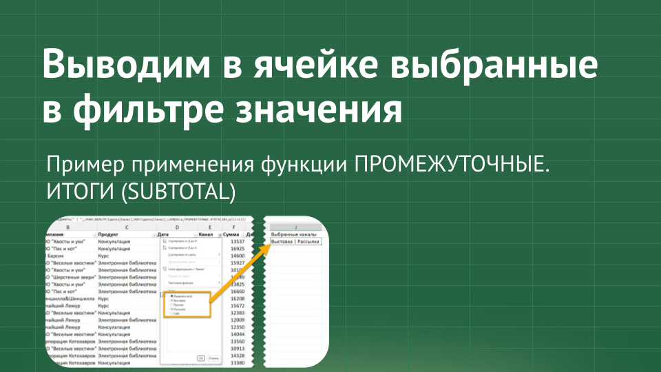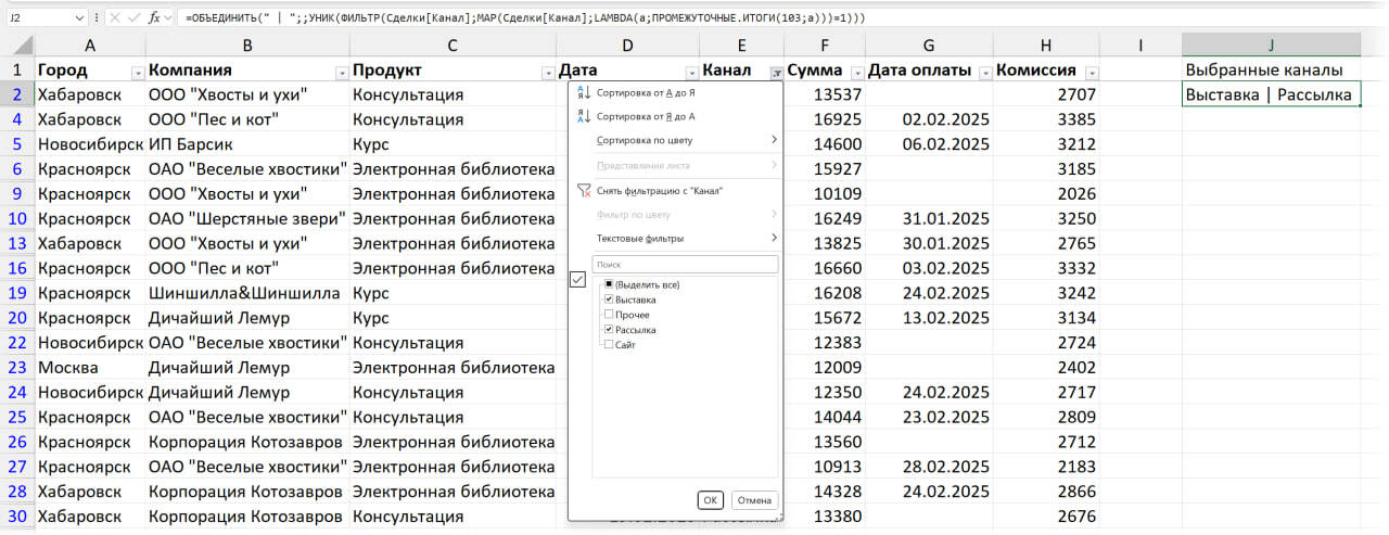 2. Далее мы отфильтруем столбец, который проверяем (в примере — канал продаж) по этим единицам, то есть по видимым строкам. Используем функцию FILTER (ФИЛЬТР).