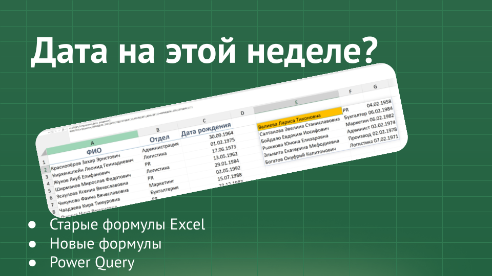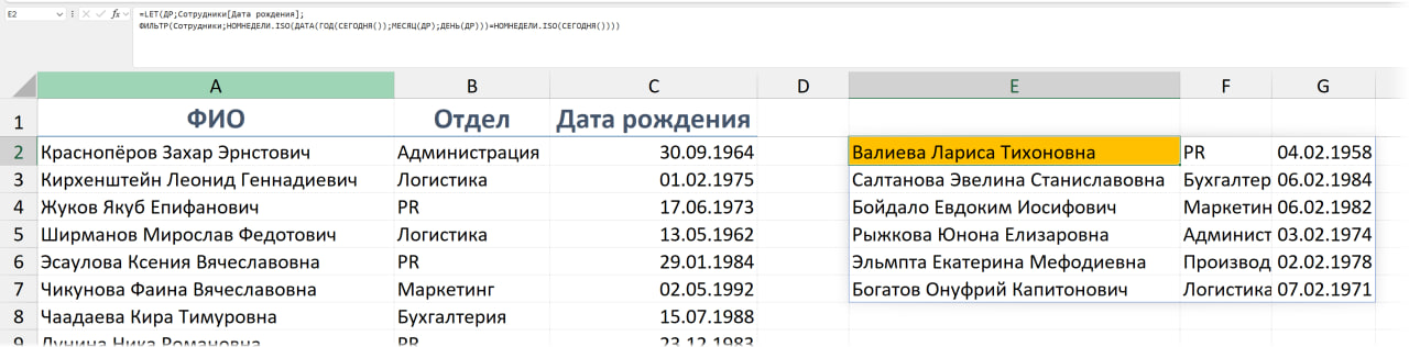 На новых формулах будем сразу выводить список всех, у кого ДР на этой неделе, с помощью ФИЛЬТРа.